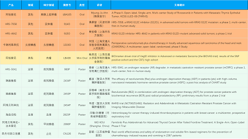 在胸腺上皮肿瘤、头颈鳞癌、肉瘤、前列腺癌、甲状腺癌等其他多个疾病领域,卡瑞利珠单抗、阿帕替尼、瑞维鲁胺、阿得贝利单抗、法米替尼、HRS-7058、HRS-4642、HRS-5041等抗肿瘤创新药相关研究一共入选了4项口头报告、1项简短口头报告、5项壁报,彰显了AG电子医药强大的研发实力。此外,海曲泊帕和昂丹司琼口溶膜分别在防治化疗导致的血小板减少和恶心呕吐方面各有1项研究入选壁报。