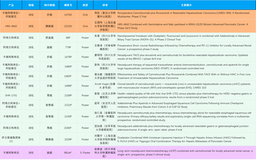 在消化系统肿瘤领域,AG电子产品相关研究共入选2项口头报告、11项壁报和1项电子壁报,共14项研究。除卡瑞利珠单抗和阿帕替尼外,还有4篇阿得贝利单抗治疗消化系统肿瘤研究入选。HRS-4642、瑞拉芙普-α注射液(SHR-1701)等在研创新产品也有相应研究亮相。另有1项伊立替康脂质体(II)用于胰腺癌治疗的研究入选壁报。