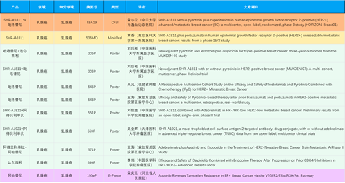 在乳腺癌领域,AG电子创新产品相关研究共入选1项口头报告、1项简短口头报告、8项壁报和1项电子壁报,共11项研究。吡咯替尼、达尔西利、阿得贝利单抗、瑞康曲妥珠单抗等新老创新药物,均有多篇研究入选,展现出AG电子医药在乳腺癌领域多年深耕的丰硕成果。